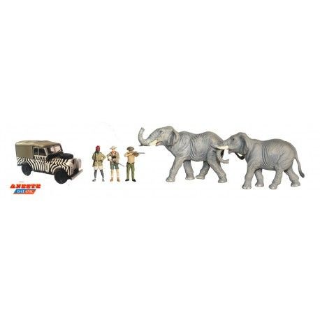 Set de safari con cazadores en 1/87. Incluye Land Rrover Defender, dos elefantes y tres cazadores.